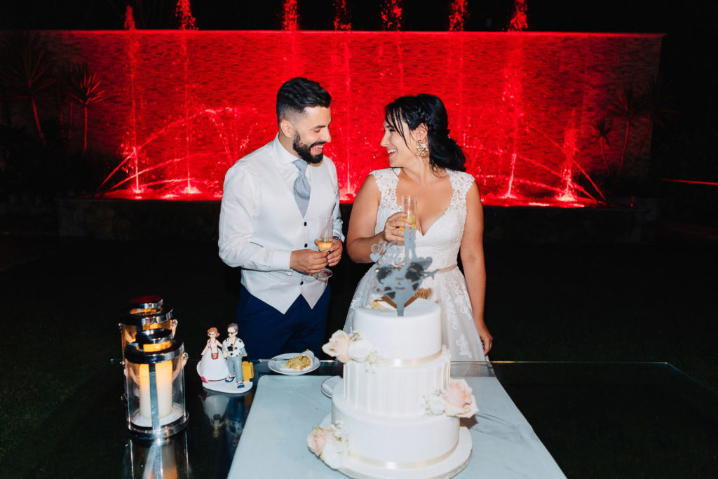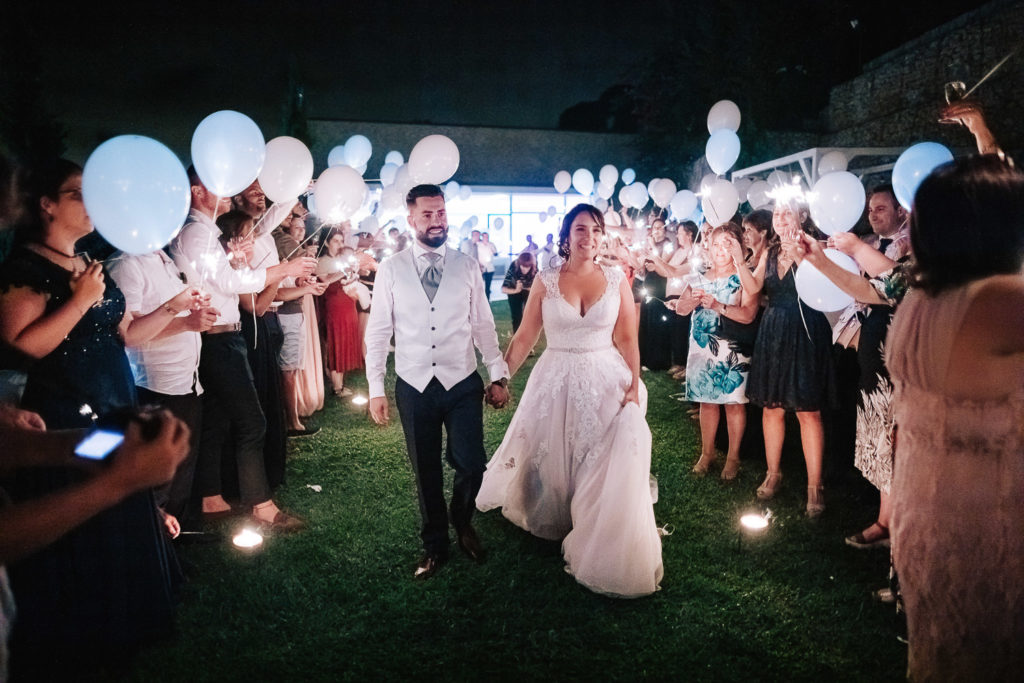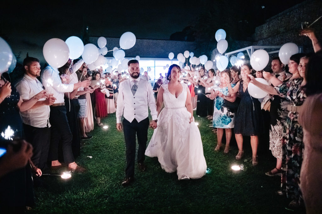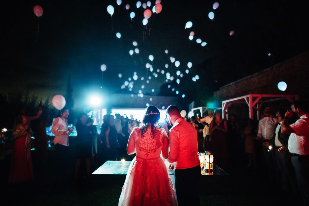 No corte do bolo, o casal foi recebido pelos convidados com balões de leds que foram jogados ao ar, deixando o céu todo iluminado.