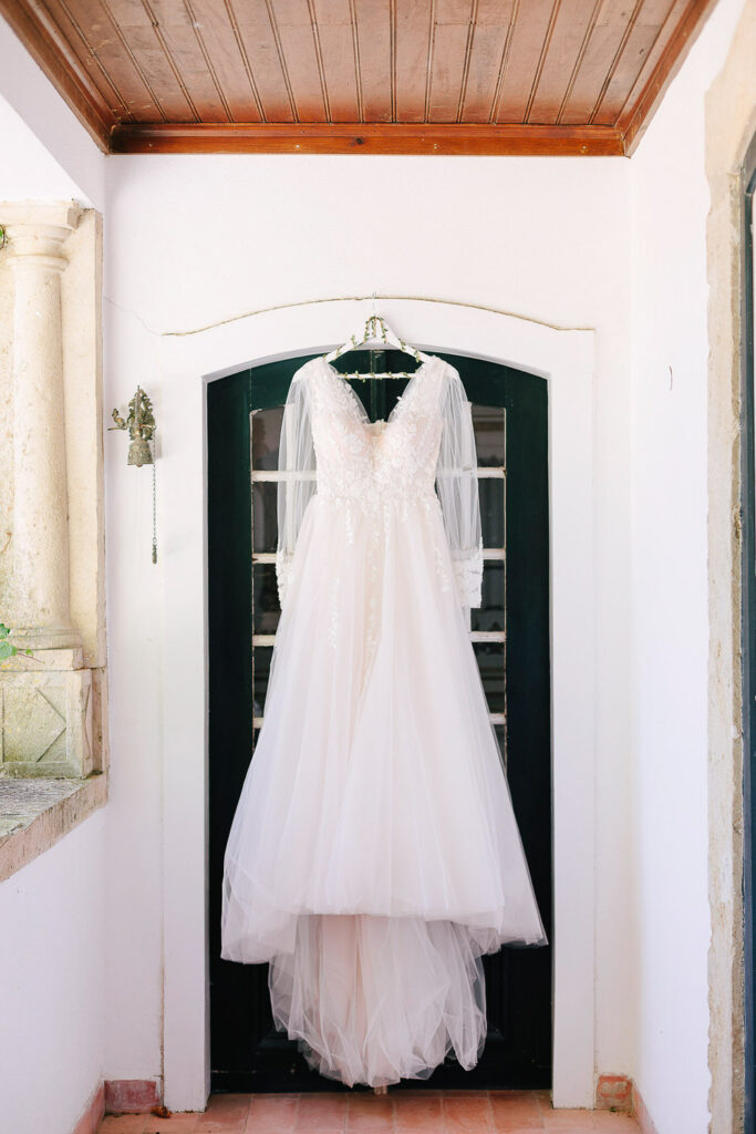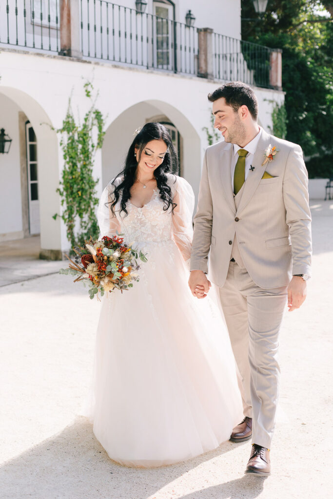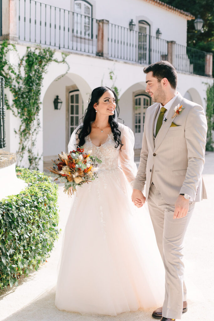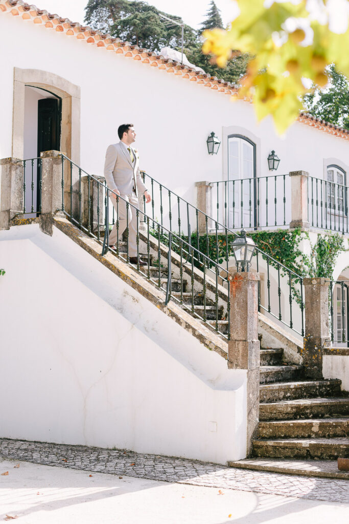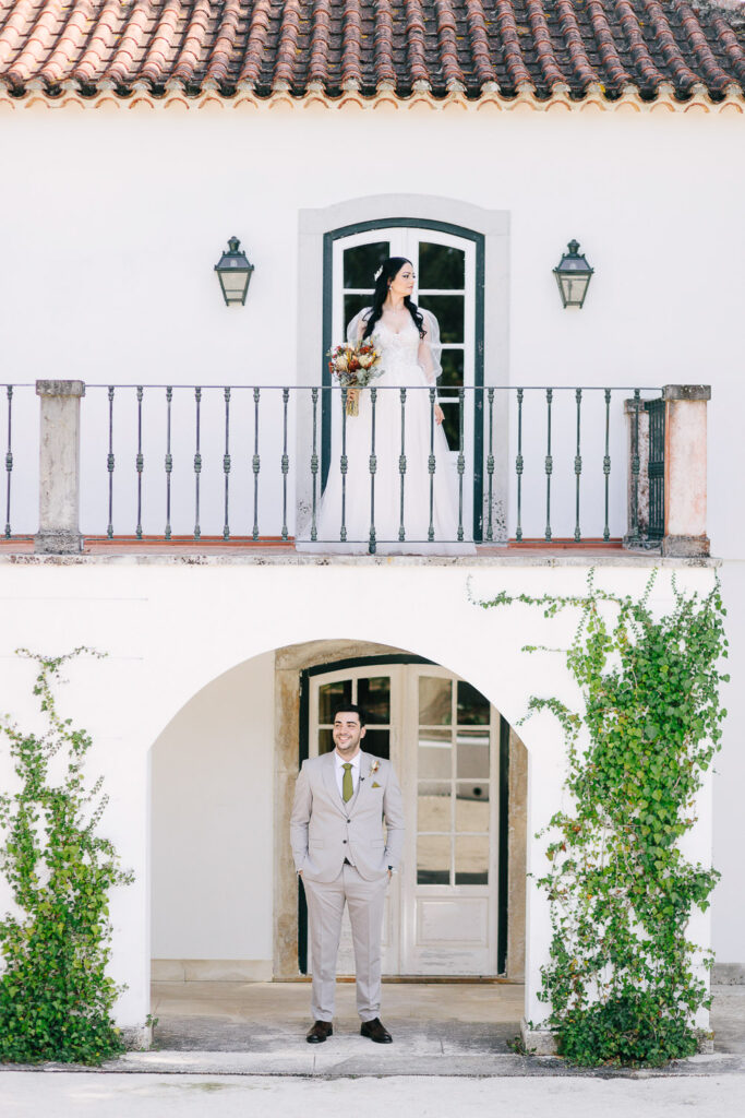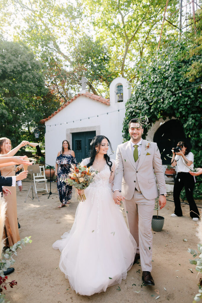 Na verdade tivemos duas cerimónias, um mês antes com um lindo Elopement dentro da Serra de Sintra e agora com essa cerimônia tradicional que foi realizada ao ar livre e a decoração do evento foi um espetáculo à parte. Elementos rústicos como madeira e plantas foram cuidadosamente selecionados para compor o ambiente e criar um clima romântico e intimista.