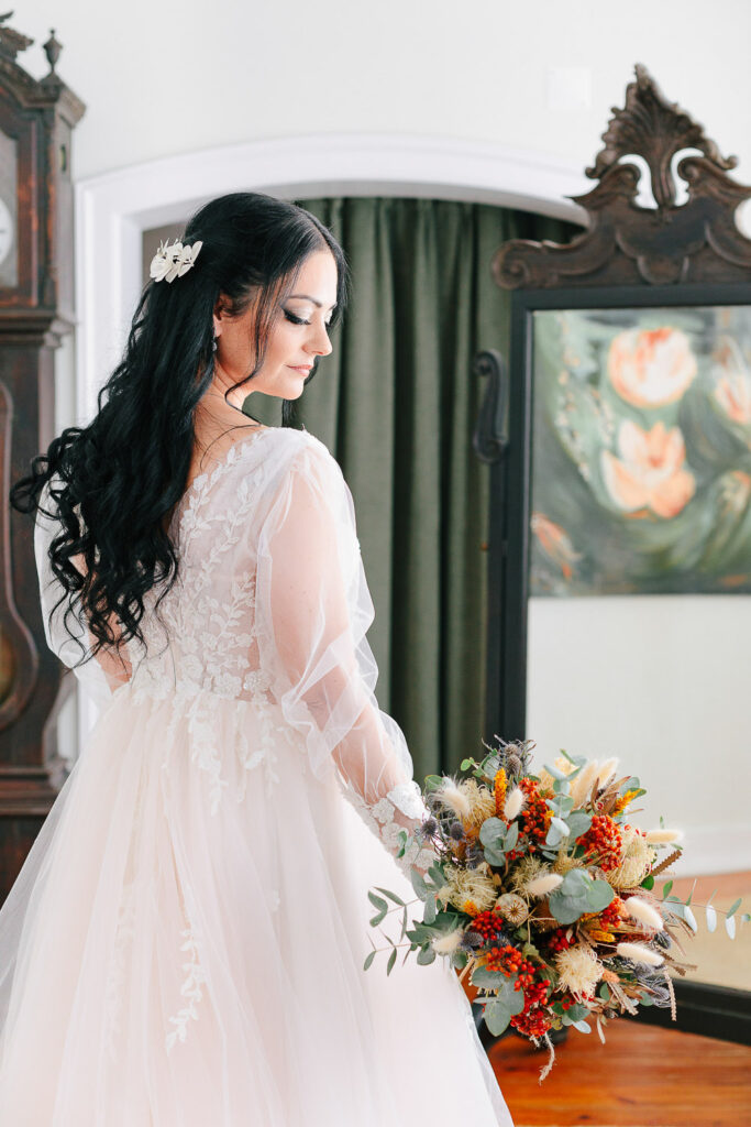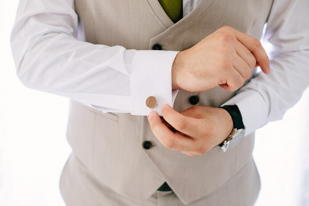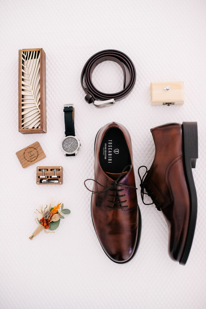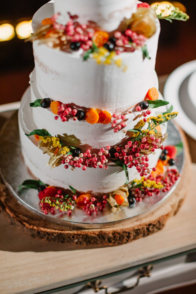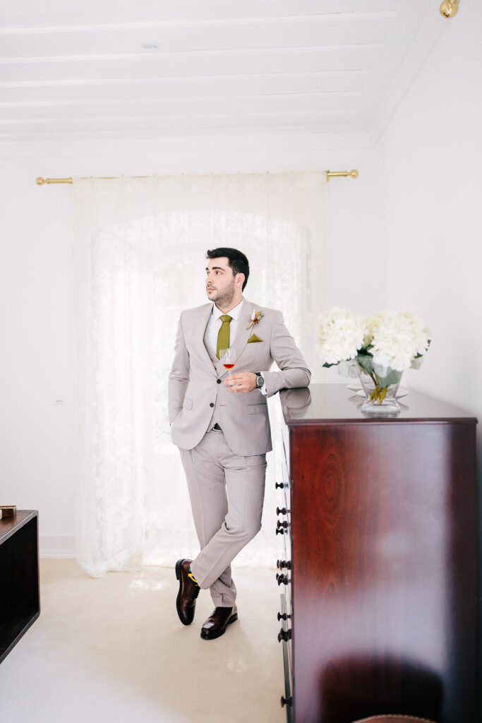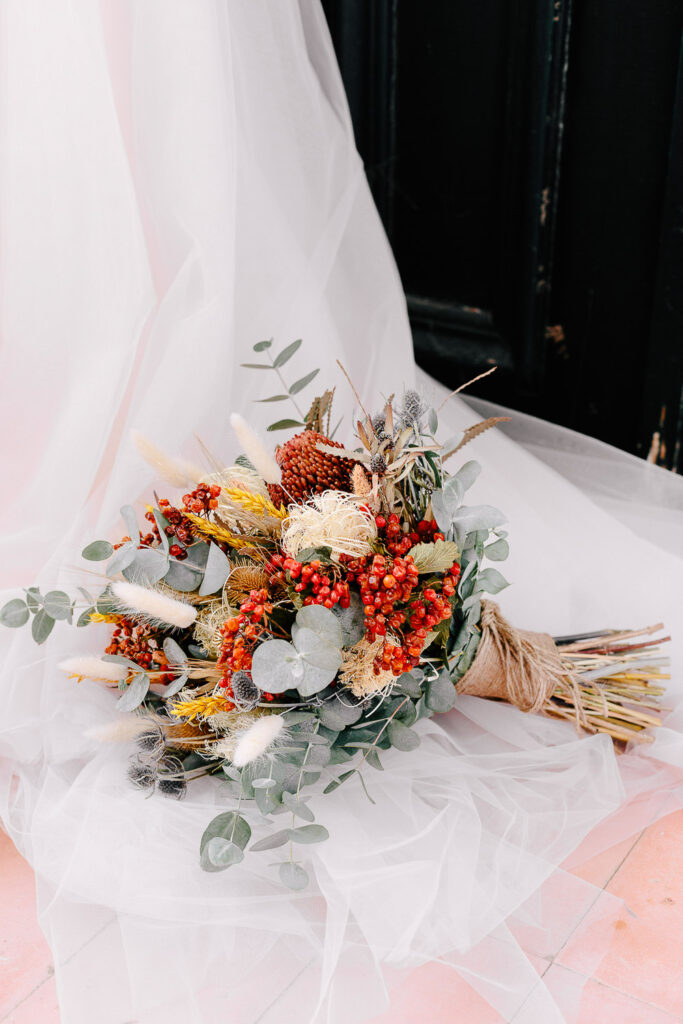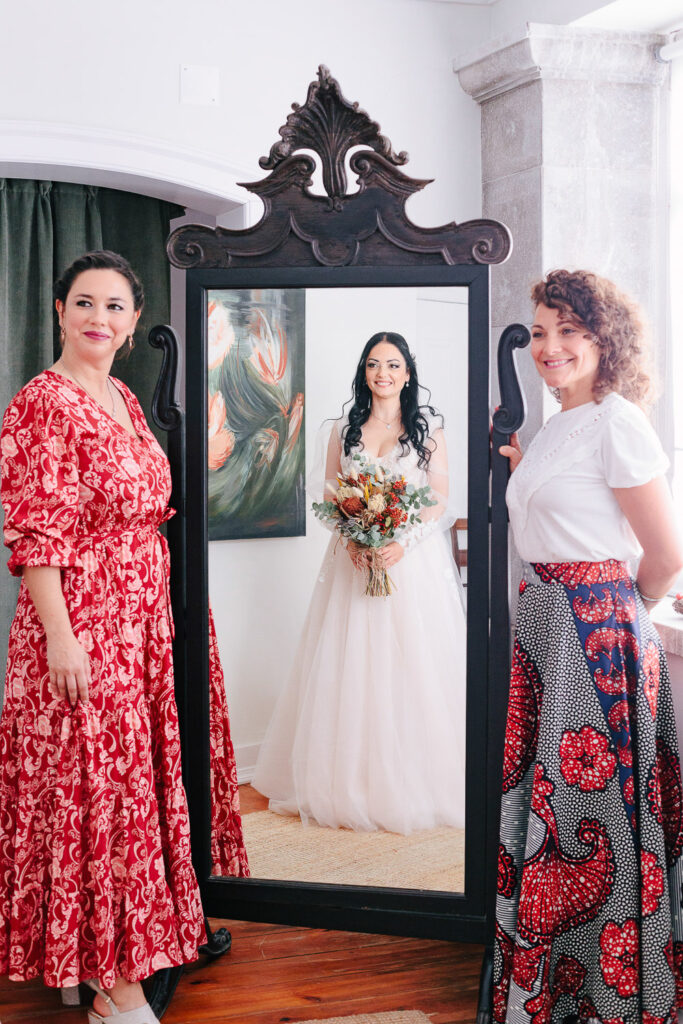 Na verdade tivemos duas cerimónias, um mês antes com um lindo Elopement dentro da Serra de Sintra e agora com essa cerimônia tradicional que foi realizada ao ar livre e a decoração do evento foi um espetáculo à parte. Elementos rústicos como madeira e plantas foram cuidadosamente selecionados para compor o ambiente e criar um clima romântico e intimista.