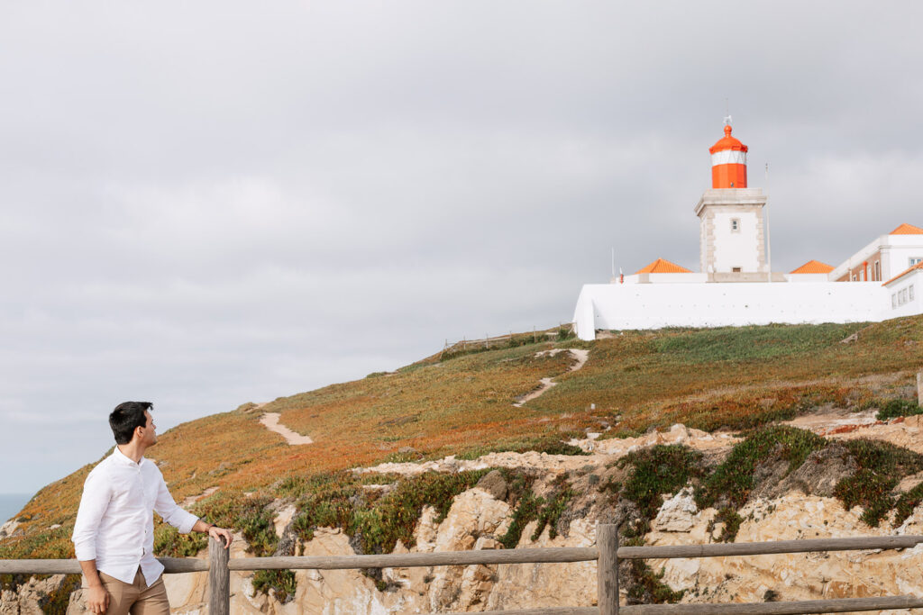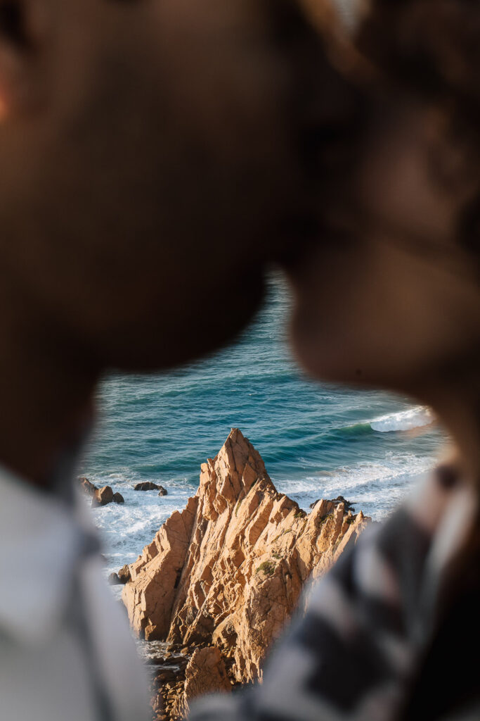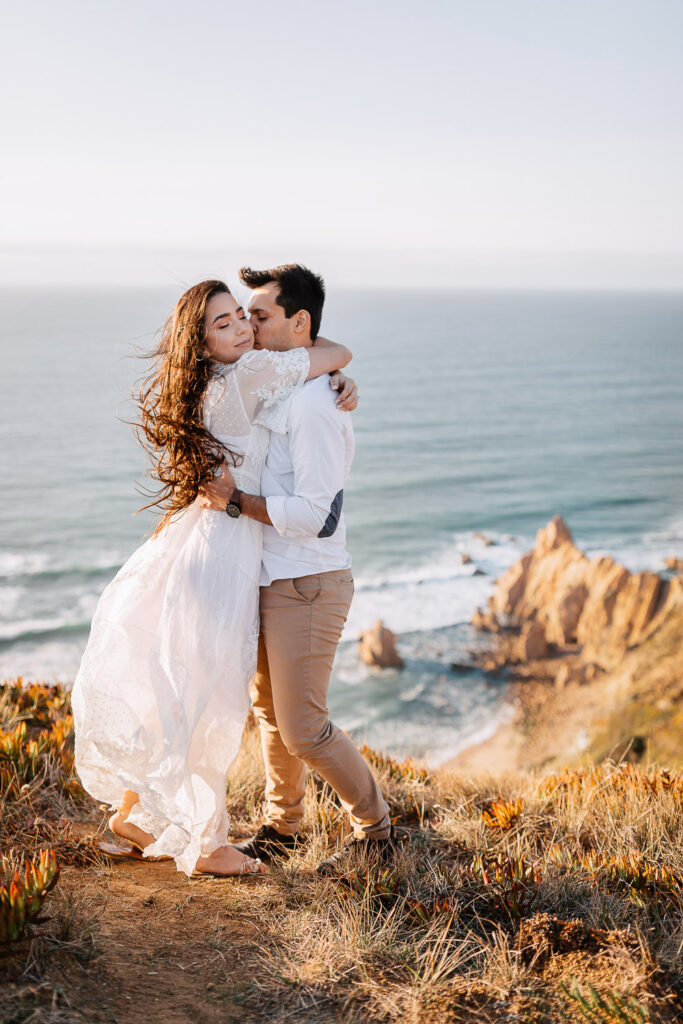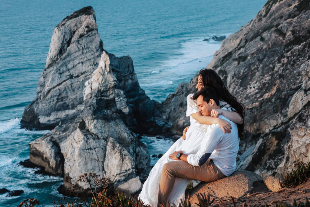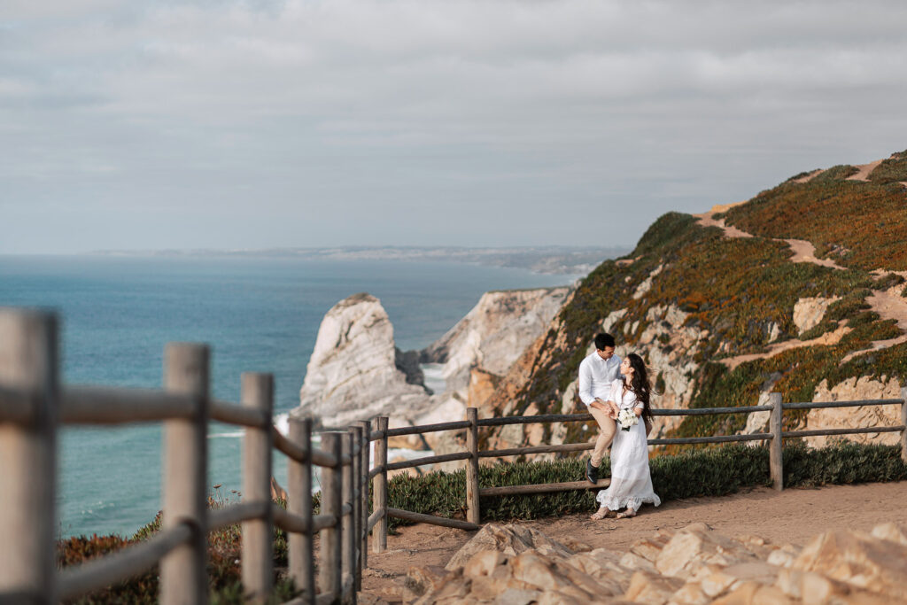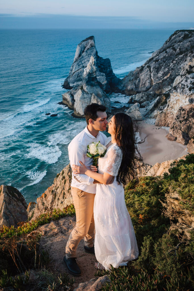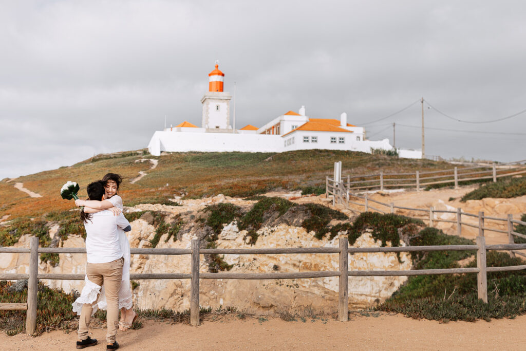 E no final de setembro, fomos a Sintra, lugar escolhido por eles para celebrar a união. Assim que chegamos na cidade, ficamos bem tristes, porque o tempo estava muito fechado com o céu bem escuro, bem típico de início de outono. Mas foi incrível o quanto o tempo mudou logo que chegamos no Cabo da Roca, que para quem não conhece, é o ponto mais ocidental da Europa e o céu aberto com aquela luz linda como tanto queríamos, estava lá nos aguardando. E lá mesmo no Cabo da Roca fizemos o First Look, após esse momento entre os dois continuamos em direção para a praia da Ursa, que fica alguns poucos metros de distancia, para fazer a troca de votos e contemplarem o belíssimo pôr do sol, que por sinal estava ainda mais bonito que em outros dias.