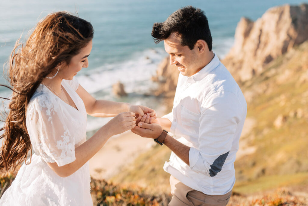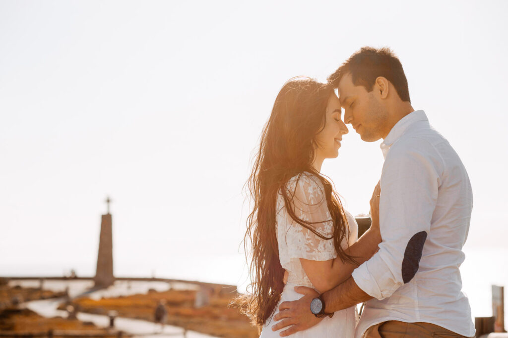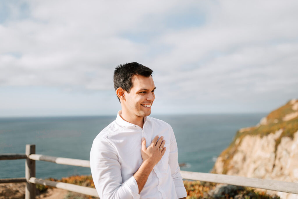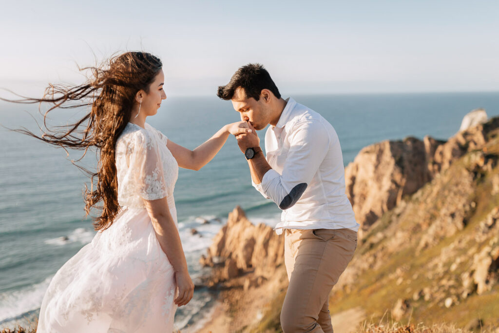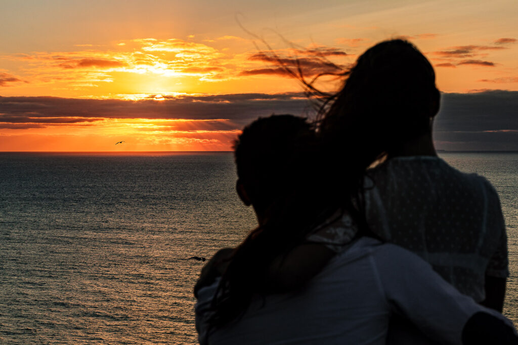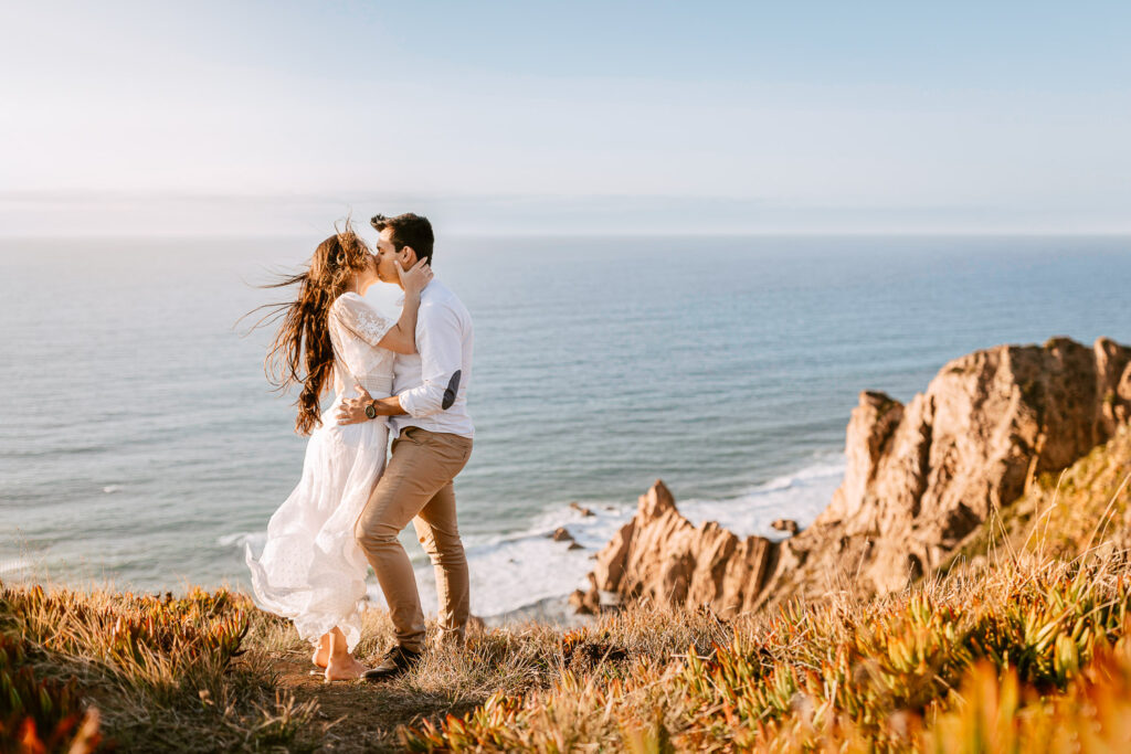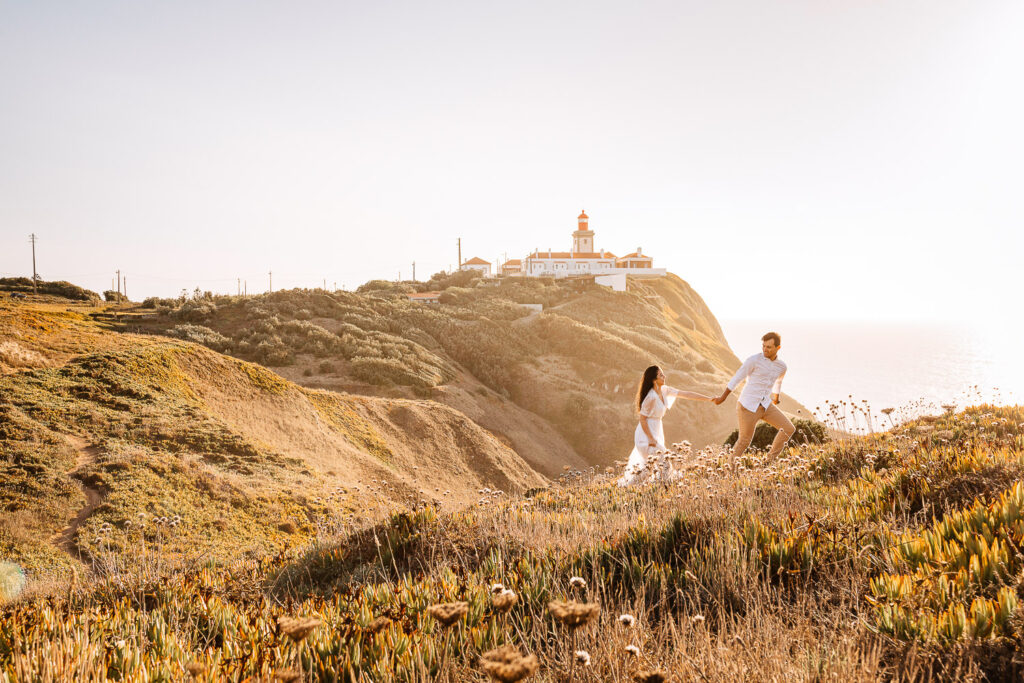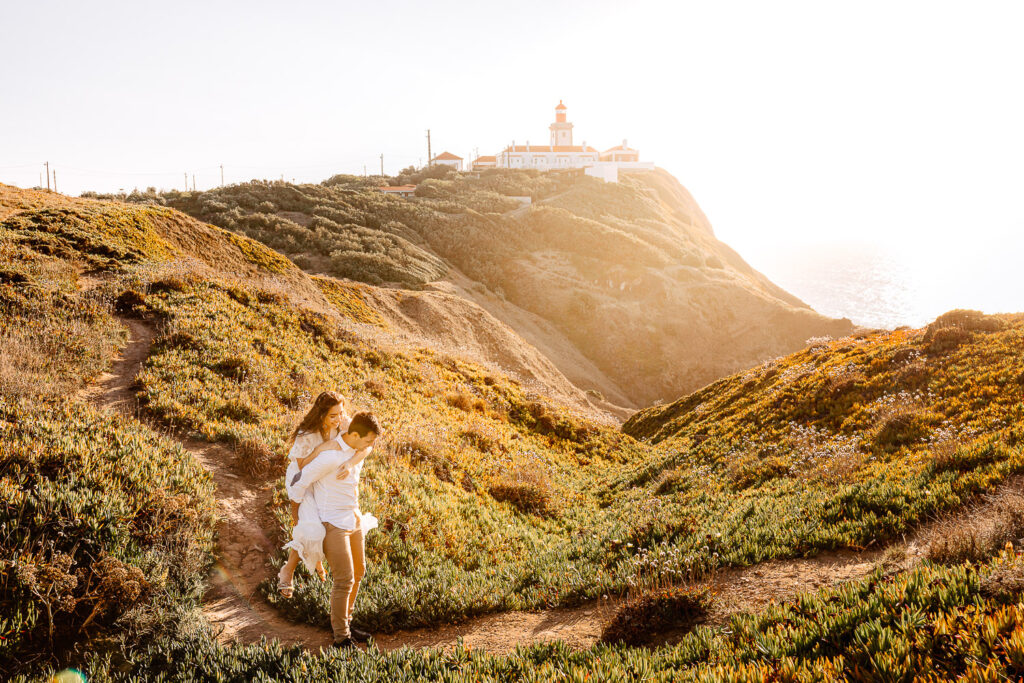 E no final de setembro, fomos a Sintra, lugar escolhido por eles para celebrar a união. Assim que chegamos na cidade, ficamos bem tristes, porque o tempo estava muito fechado com o céu bem escuro, bem típico de início de outono. Mas foi incrível o quanto o tempo mudou logo que chegamos no Cabo da Roca, que para quem não conhece, é o ponto mais ocidental da Europa e o céu aberto com aquela luz linda como tanto queríamos, estava lá nos aguardando. E lá mesmo no Cabo da Roca fizemos o First Look, após esse momento entre os dois continuamos em direção para a praia da Ursa, que fica alguns poucos metros de distancia, para fazer a troca de votos e contemplarem o belíssimo pôr do sol, que por sinal estava ainda mais bonito que em outros dias.
