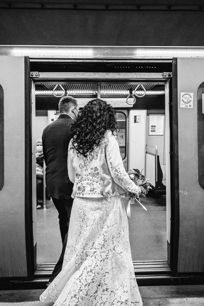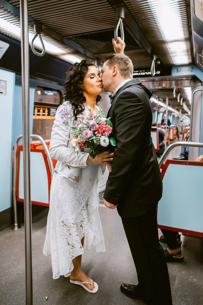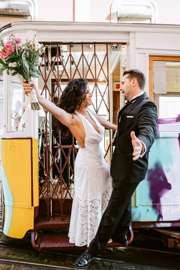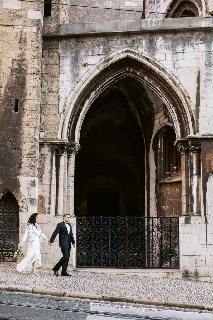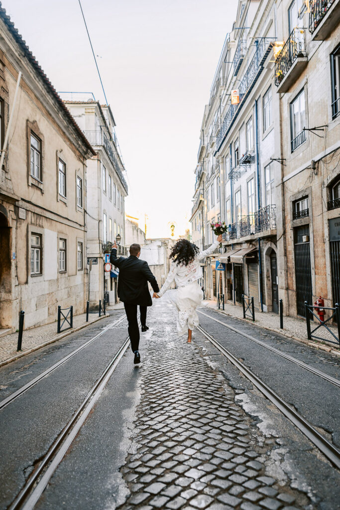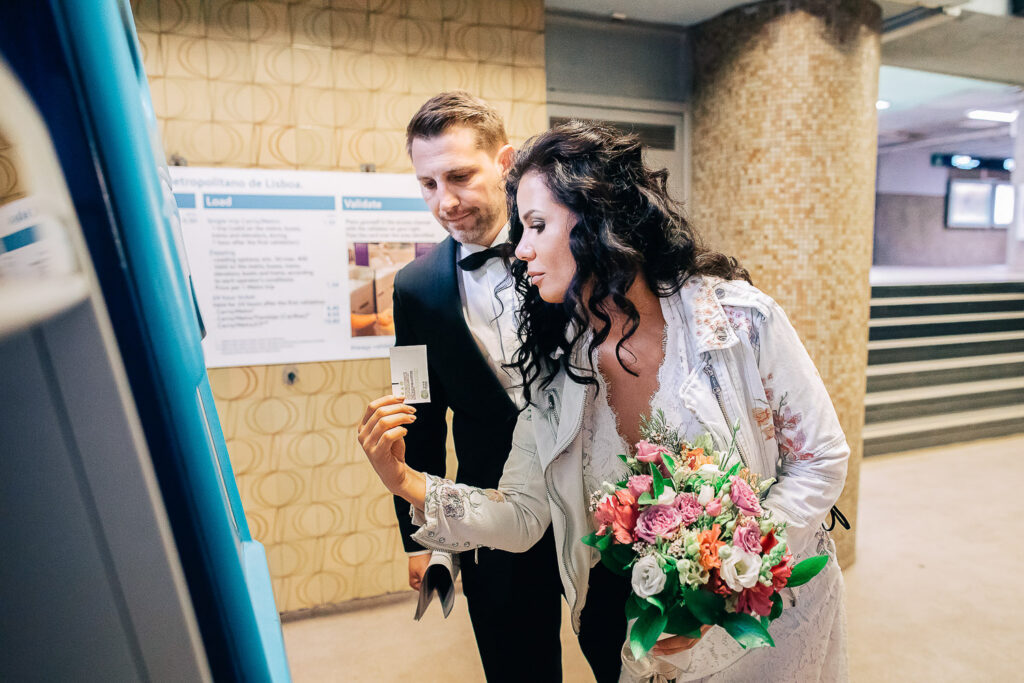 Depois desse lindo momento do nascer do sol, como já esperávamos, o casal teve as ruas de Lisboa completamente para eles, e puderam ter várias fotos com um Elopement bem Urbano, com direito até um passeio no metrô.