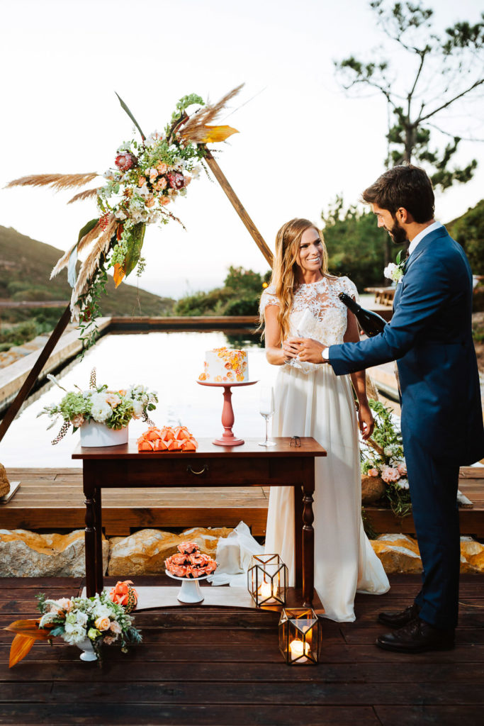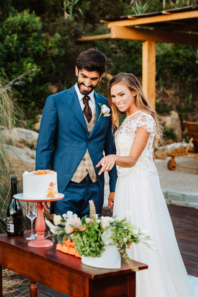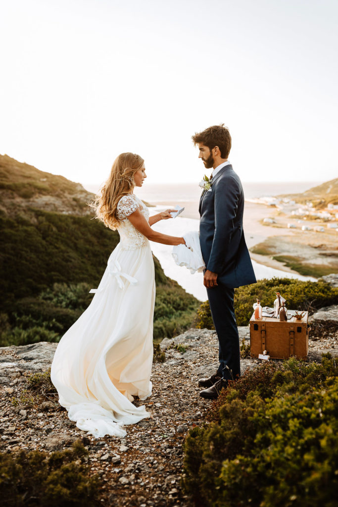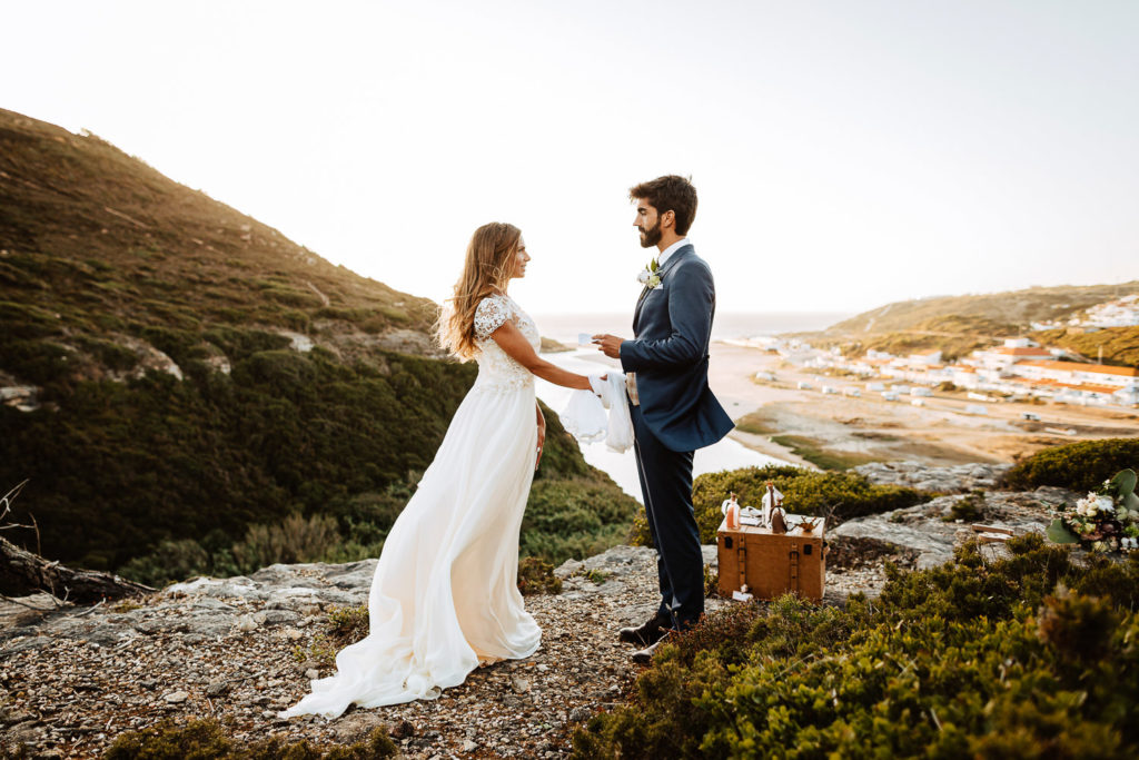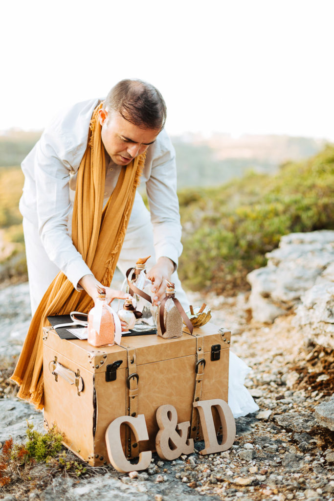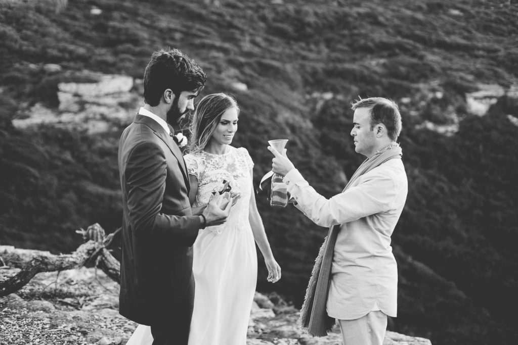 Após a preparação dos noivos, o Celebrante Telmo Dinis já os aguardava num penhasco para a renovação dos votos, onde realizou o ritual das areias e tinha como cenário uma linda paisagem praiana.